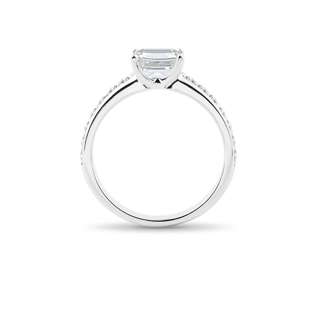 Luxueuse bague en or blanc 14 carats ornée d'un diamant de synthèse central, arborant une taille émeraude. Cette pierre d'une clarté et d'une brillance exceptionnelles est complétée par des diamants de taille brillant le long de l'anneau. Il s'agit d'une bague éblouissante, idéale pour une demande en mariage.