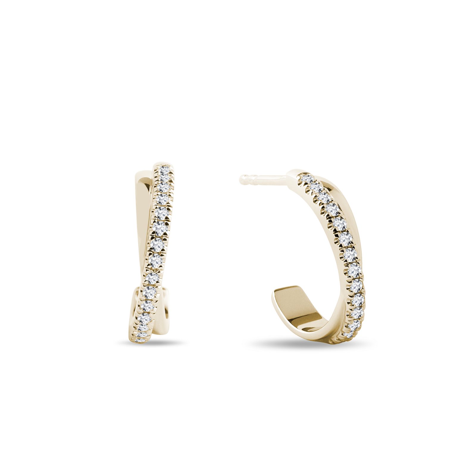 Boucles d'oreilles élégantes de forme semi-circulaire en or jaune 14 carats et ornées de 32 diamants clairs. Cette rangée de diamants sertie de manière asymétrique confère un éclat sophistiqué et une élégance intemporelle. La taille brillant, grand classique des diamants, met en valeur la beauté des pierres. Un ensemble harmonieux, sobre mais incontournable.
