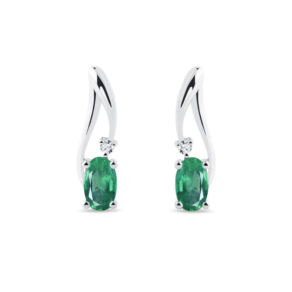 Boucles d'oreilles en or blanc 14 carats avec émeraudes et diamants. Chaque boucle consiste en un socle d'or blanc sculpté en forme d'ondulation retroussée, lequel maintient en place l'émeraude de coupe ovale et le diamant la surplombant. Une pièce au charme chic et luxueux pour sublimer les tenues de toutes les occasions.