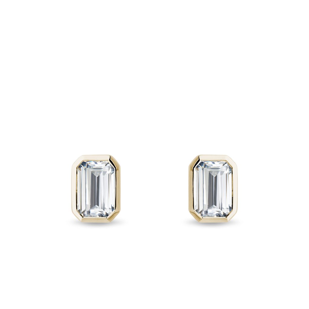 Élégantes boucles d'oreilles en or jaune 14 carats ornées de diamants de synthèse dans une taille émeraude et montés dans un serti clos. Cette combinaison leur confère un éclat magnifique tout en étant agréables à porter au quotidien. Il s'agit d'un bijou intemporel qui convient aux femmes de tous âges.