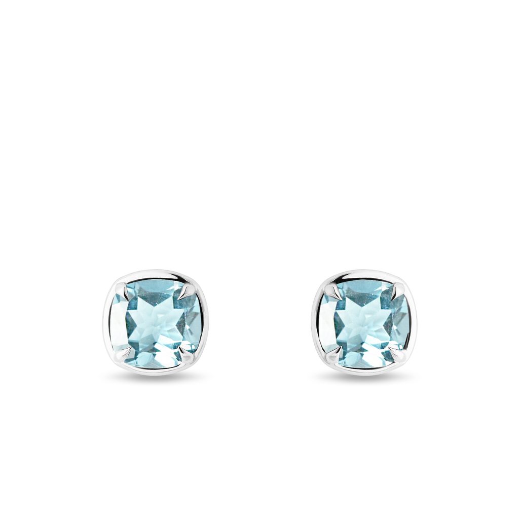 Clous d'oreilles en or blanc 14 carats ornées de topazes bleu clair dans une taille coussin originale de 6 x 6 mm. Un accessoire unique qui attirera tous les regards, à porter aussi bien au quotidien que pour une occasion spéciale.