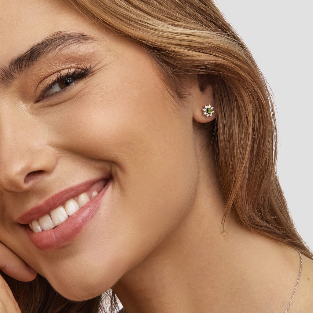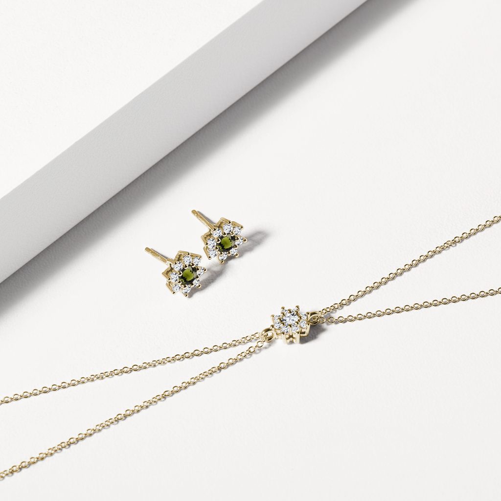 Boucles d'oreilles fleur en or jaune, moldavites et diamants