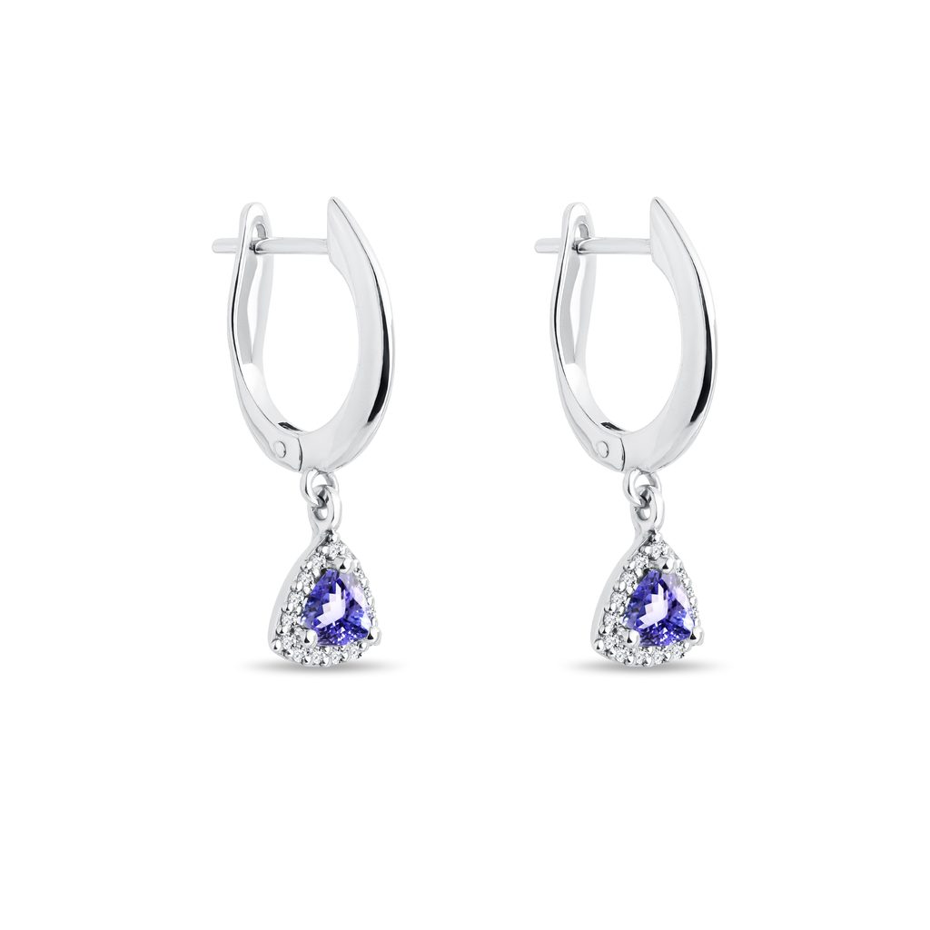 Boucles d'oreilles en or blanc 14 carats avec tanzanites et diamants. Chaque tanzanite est taillée en trillion pour amplifier tout l'éclat de sa nuance. Elle est également entourée par une couronne de diamants qui complémente la luminosité de la boucle. Cette paire représentera un accessoire idéal pour célébrer, par exemple, la naissance d'un enfant.