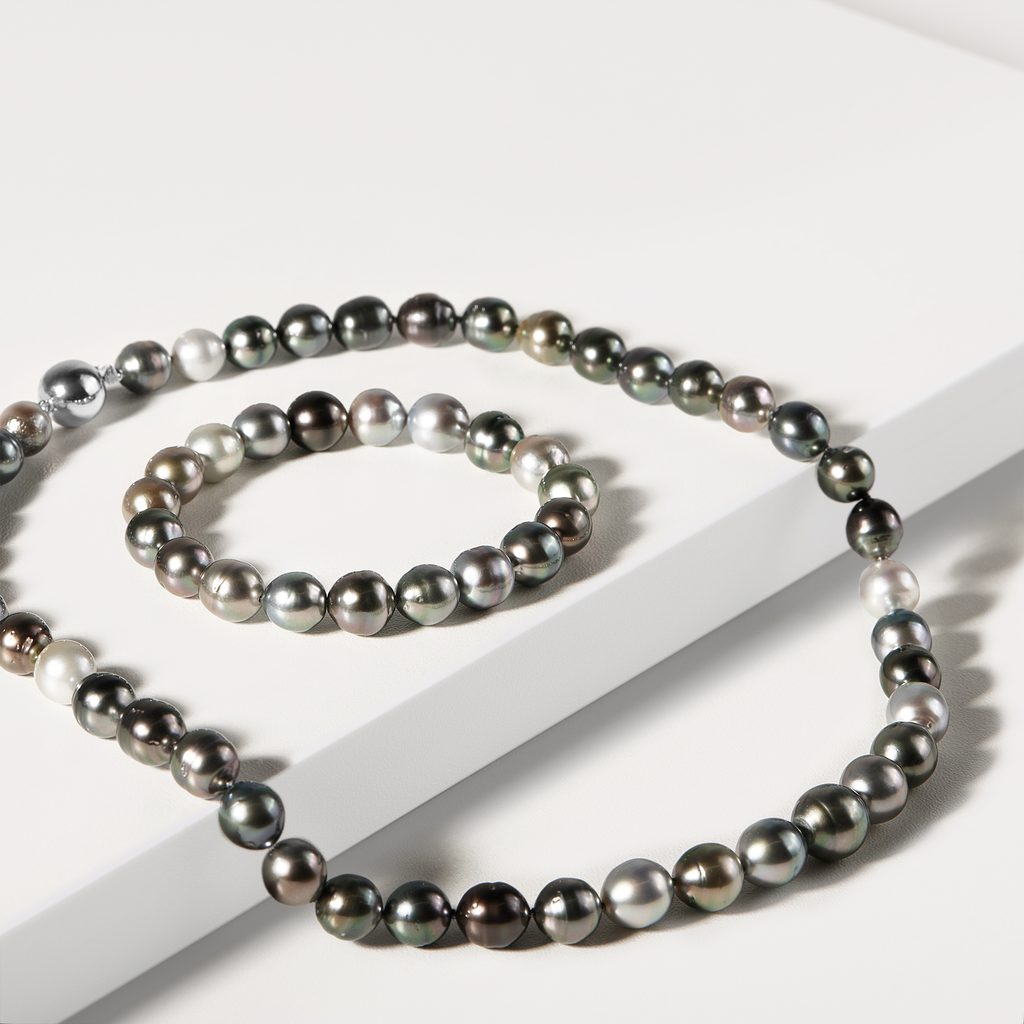 Ce bracelet luxueux se compose de 20 perles de Tahiti d'un diamètre de 8 à 11 mm. Grâce à la nuance de couleurs des perles, allant du gris foncé au gris argenté, le bijou revêt un dégradé naturel de couleurs. Chaque perle est enfilée à la main dans notre studio, ce qui garantit un design unique et inimitable.
