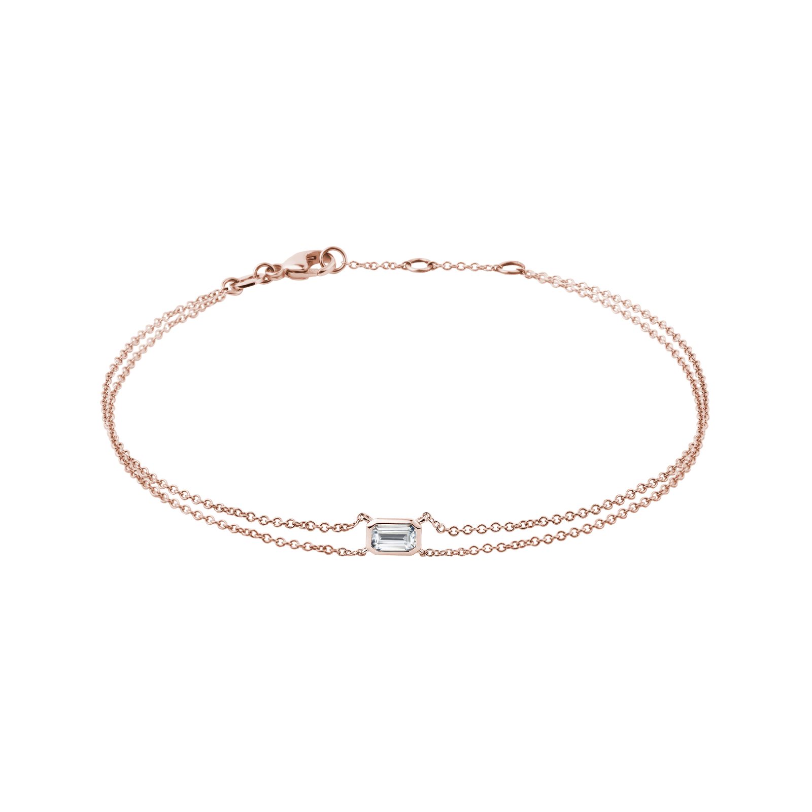 Bracelet minimaliste en or rose 14 carats orné d'un diamant de synthèse dans une taille émeraude et monté dans un serti clos. La double chaîne confère au bijou un aspect original et lui apporte du mouvement. Un choix idéal pour les femmes qui apprécient l'élégance simple et les détails subtils.