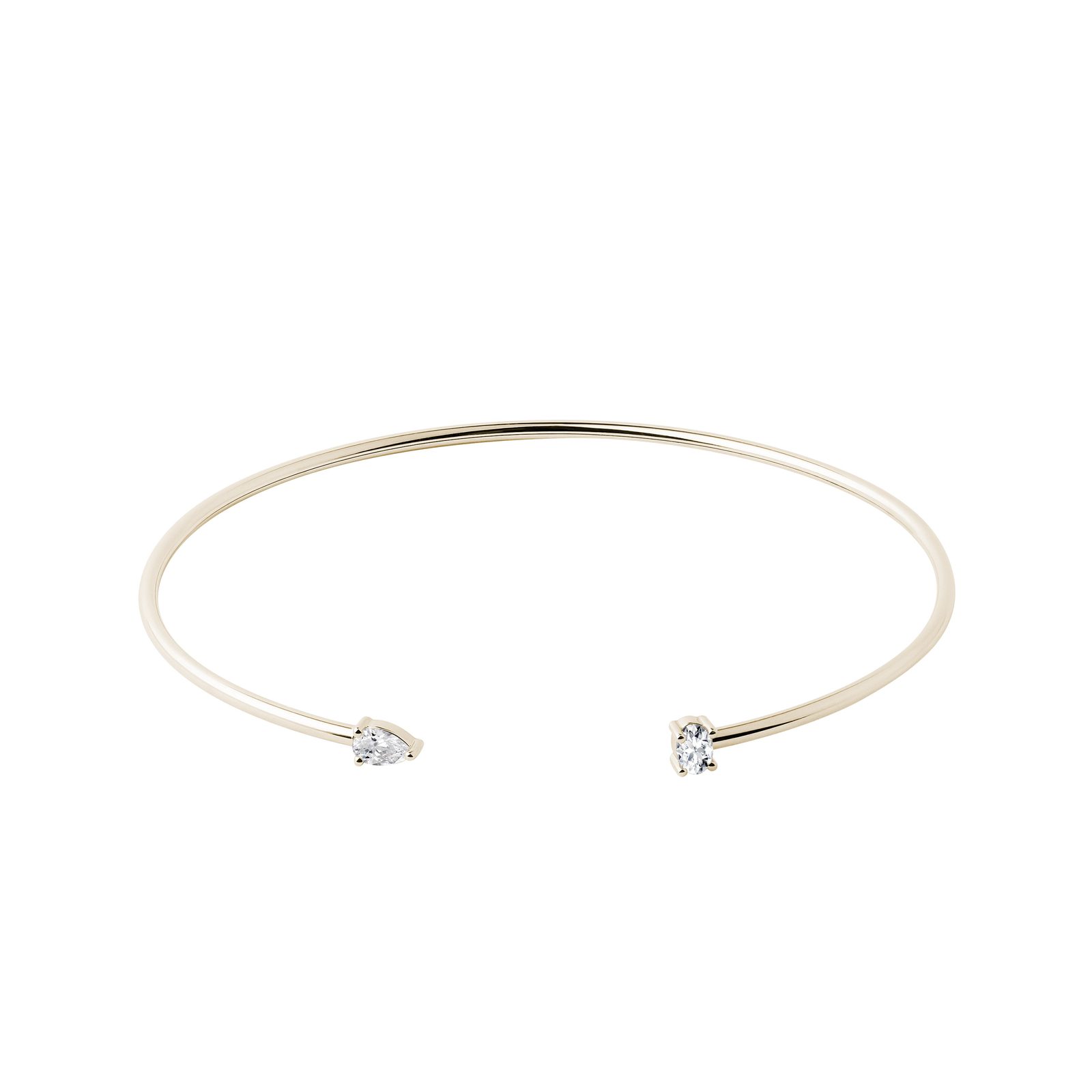 Bracelet jonc en or jaune 14 carats délicat et intemporel. Un diamant en goutte d'eau et un autre de taille ovale brillent à ses extrémités, conférant au bijou une allure raffinée et un éclat subtil. Grâce à sa forme flexible, le bracelet est facile à ajuster et confortable à porter tout au long de la journée. Il complétera élégamment toute tenue, que vous le portiez seul ou en combinaison avec d'autres bijoux.