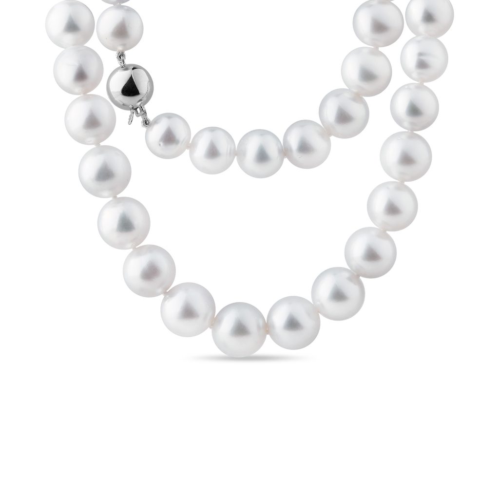 Ce collier de perles classique de 43 cm de long est composé de perles du Pacifique Sud d'un diamètre de 10-13 mm de qualité A. Les perles d'un blanc soyeux brillent délicatement et confèrent au bijou un caractère élégant et sophistiqué. Le fermoir en forme de boule en or blanc 14 carats se fond avec élégance dans cette rangée de perles. Il s'agit d'un bijou exclusif, disponible en un seul exemplaire.