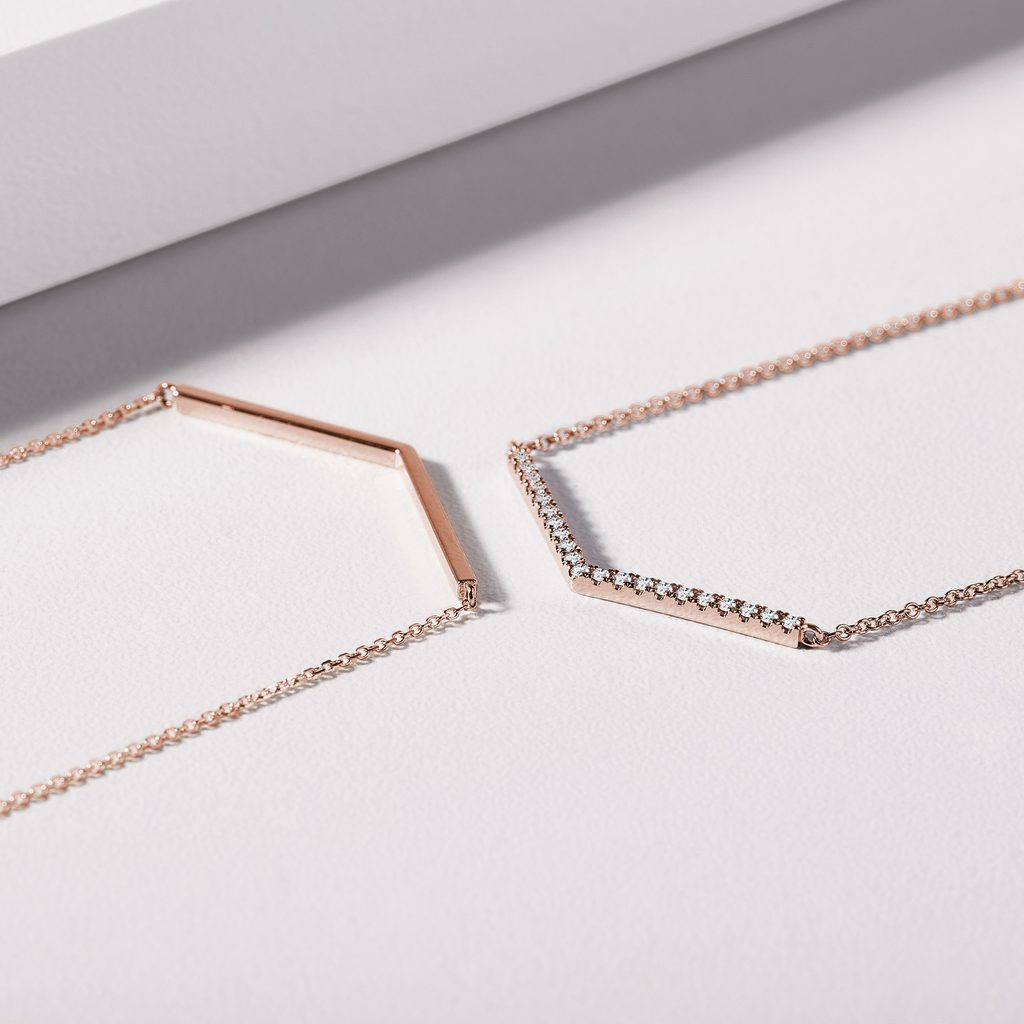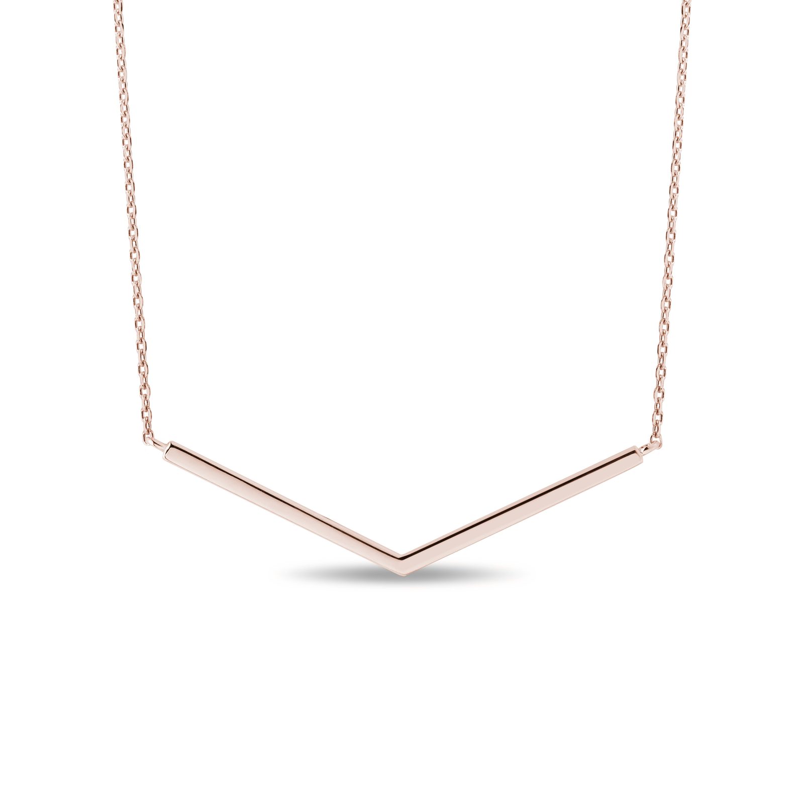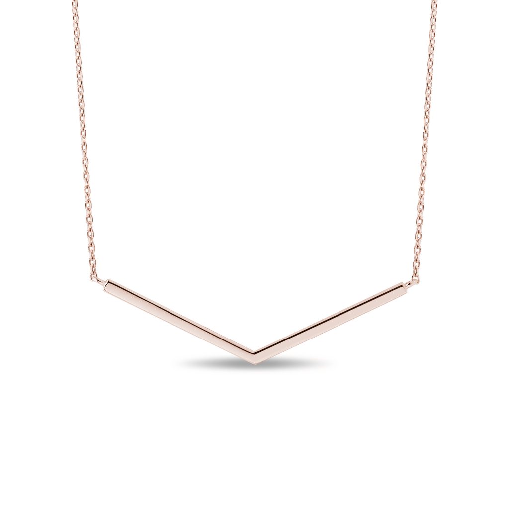 Ce collier moderne en or rose 14 carats se compose d'une délicate chaîne ancre de 45 cm de long, ornée d'un pendentif solidement fixé en forme de V lisse. Grâce à ses lignes épurées et à sa finition soignée, ce bijou est léger et élégant. Il peut être porté seul ou facilement associé à d'autres colliers pour un look unique et superposé.