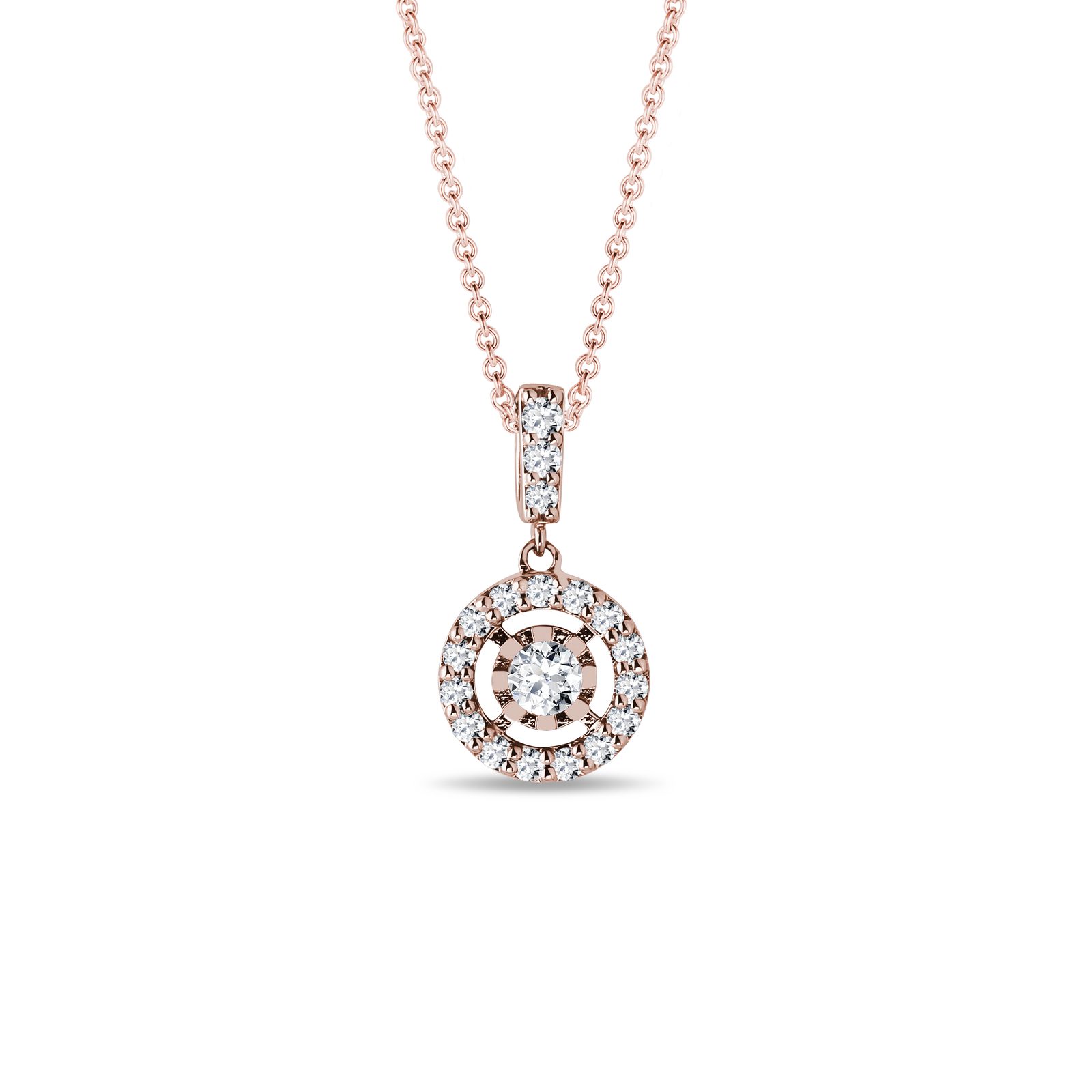 Collier luxueux en or rose 14 carats avec diamants. D'inspiration Halo, le pendentif met en valeur la courbe parfaite du cercle. Il accueille en effet en son centre un diamant central de coupe ronde dont l'éclat est magnifié par sa couronne périphérique endiamantée. Cette pièce au charme fastueux sera l'accessoire idéal afin de singulariser une tenue de soirée.