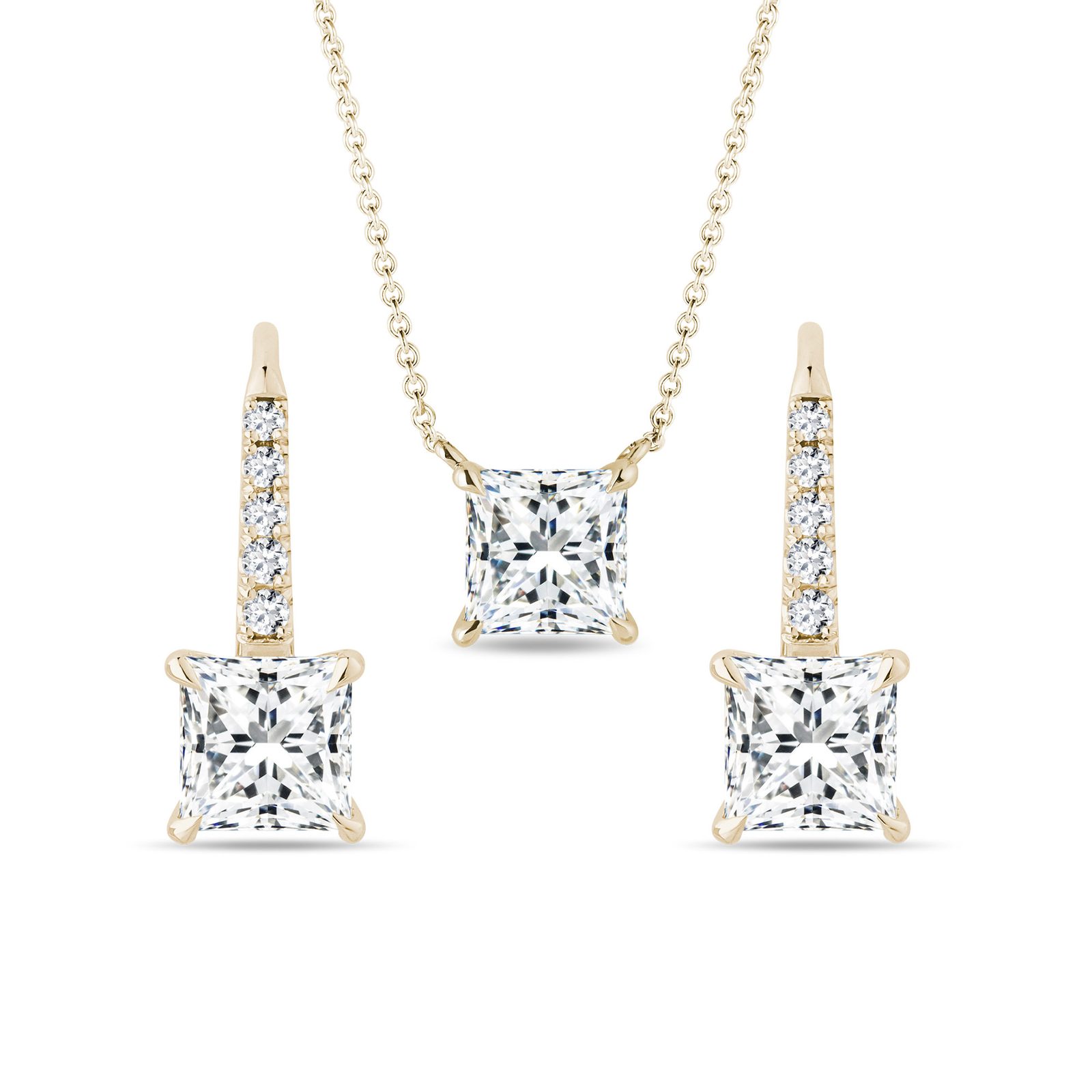 Cette luxueuse parure en or jaune 14 carats se compose de boucles d'oreilles pendantes et d'un collier, ornés de diamants princesse taille carrée. Son design classique met magnifiquement en valeur la pierre, tandis que l'éclat des diamants souligne son caractère luxueux. Un ajustement précis et une finition élégante créent un accessoire intemporel qui brillera en toute occasion. Un cadeau idéal qui ravira même les plus exigeants.