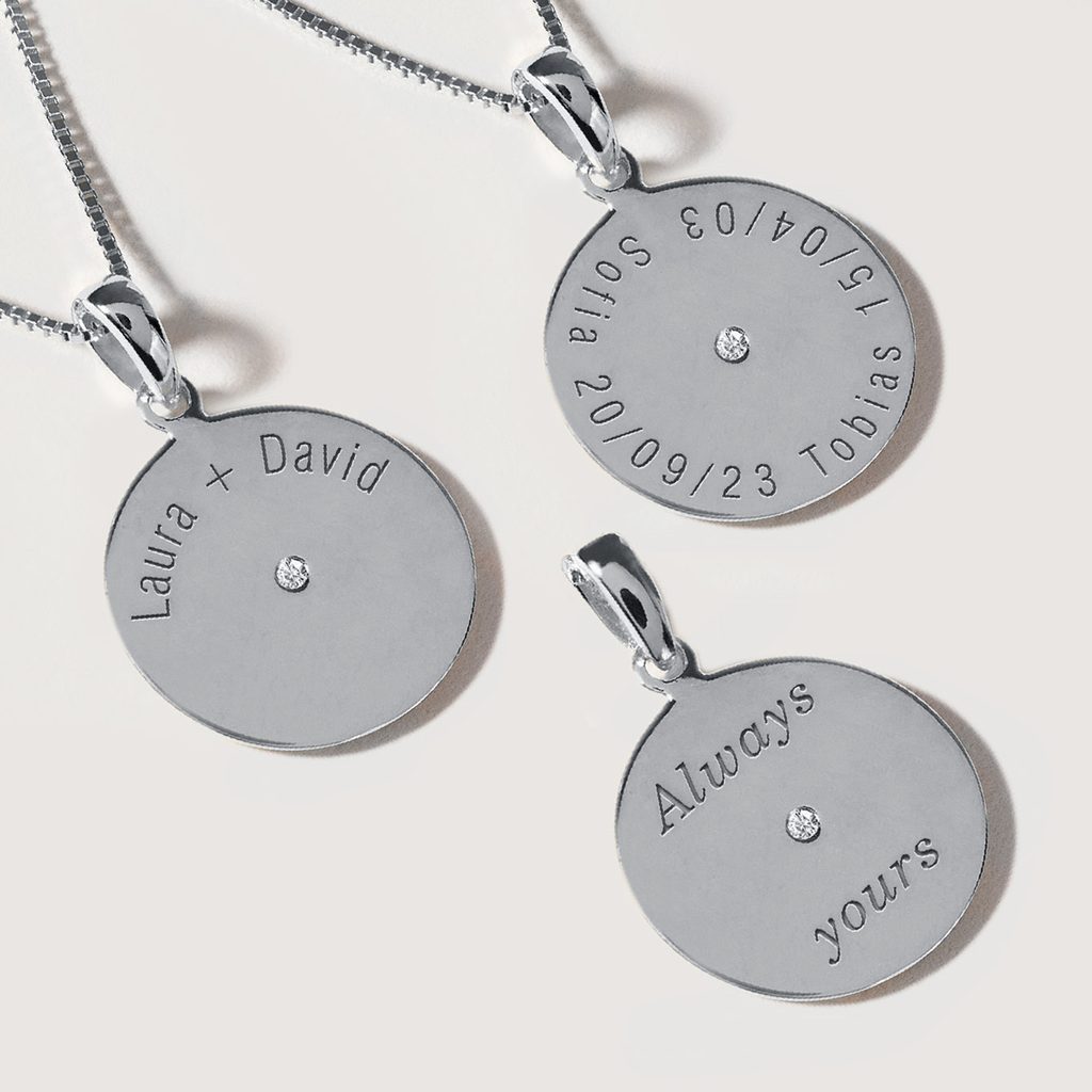 Médaillon en or blanc 14 carats d'un diamètre de 12 mm. La surface finement mate est ornée d'un motif étoile polaire gravé à la main, au centre duquel est serti un petit diamant clair. Le médaillon ne s'ouvre pas, mais peut être complété par une gravure personnalisée à l'arrière. L'œillet du pendentif (3,0 × 1,8 mm) permet de l'enfiler facilement sur toutes nos chaînes fines.