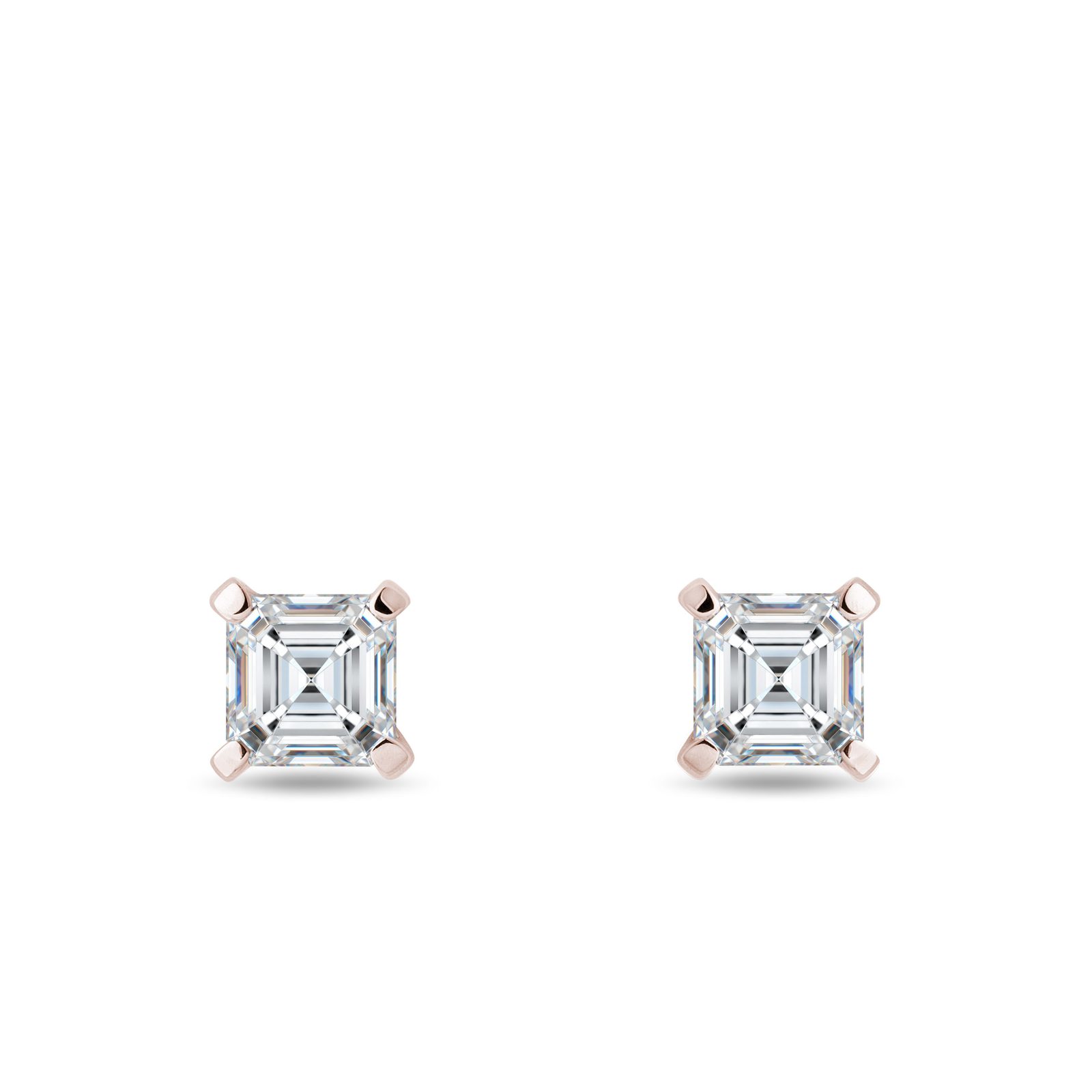 Élégantes boucles d'oreilles en diamant en or rose 14 carats. Les boucles d'oreilles séduisent par son diamant arborant une taille moins traditionnelle, appelée asscher, qui lui doit sa brillance extraordinaire. Il s'agit d'un bijou luxueux qui se porte très bien au quotidien.